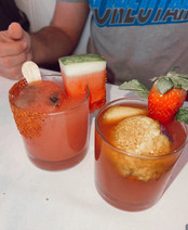 Steven pediu dois drinks: um com tequila e outro com gin. O primeiro veio com gelo gigante com melancia congelada como gelo, infusão de melancia, e um pouco de sal e pimenta na borda - parece estranho, mas estava interessante. Já o segundo era mais refrescante: de manjericão, manga e abacaxi, com gin e... FLORES.